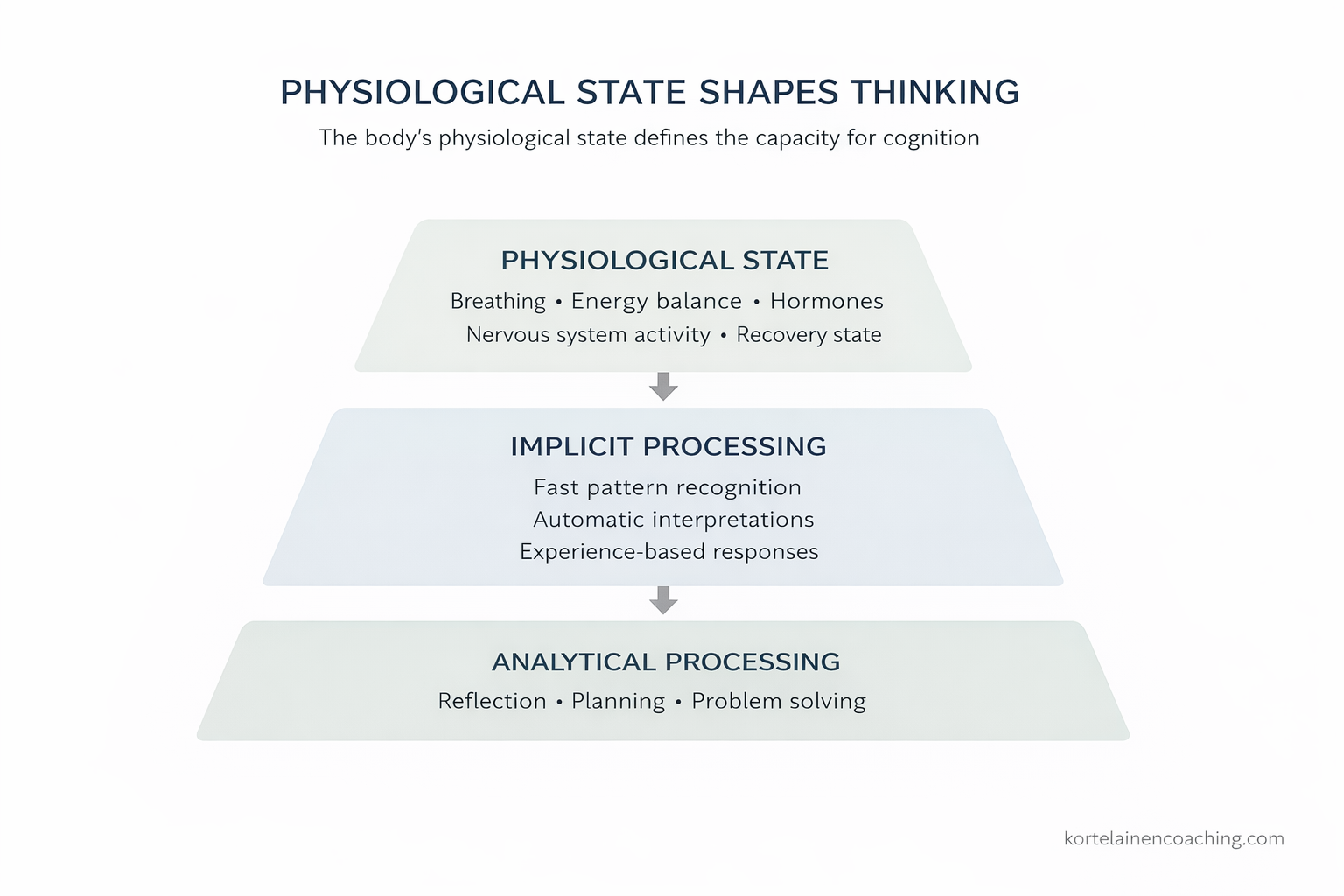Fysiologinen tila toimii aivojen tiedonkäsittelyn lähtöasetuksena. Se vaikuttaa siihen, miten implisiittinen järjestelmä tulkitsee tilanteita ja millaisessa kapasiteetissa analyyttinen ajattelu toimii. Kokemus maailmasta rakentuu tämän biologisen tiedonkäsittelyn kautta.