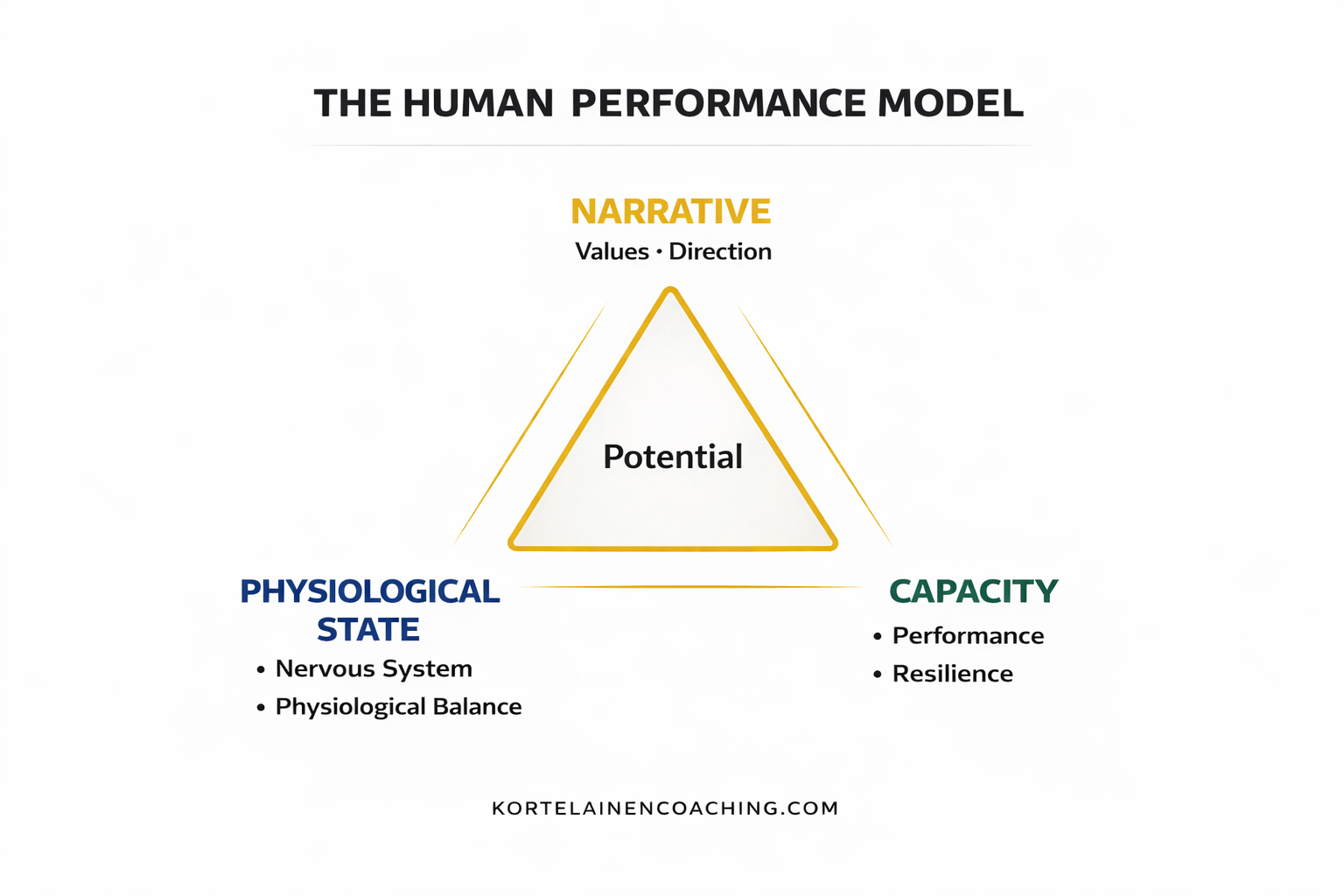 Olen huomannut, että ihmisen suorituskyky, hyvinvointi ja kyky päästä lähelle omaa potentiaaliaan rakentuvat käytännössä kolmen tekijän varaan: narratiivi, tila ja kapasiteetti. Narratiivi määrittää suunnan. Tila tarkoittaa hermoston ja kehon toimintatilaa eli sitä, millaisesta perustasta käsin toimit. Kapasiteetti määrittää, kuinka paljon pystyt käsittelemään ja kuinka korkealle pystyt kehittymään.